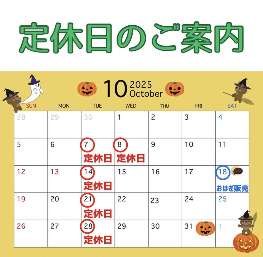 2025年10月の営業日のお知らせおしらせ 10月の定休日は下記の通りです。 10/7(火)10/8(水)10/9(火)10/14(火)10/21(水)10/28(火) 今月のおはぎの詳細は後日Instagramにてご案内します。 10月もよろしくお願いいたします。
